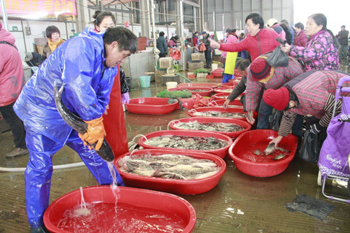 當(dāng)然,節(jié)日的餐桌上也少不了蝦兵蟹將,水產(chǎn)區(qū)平日經(jīng)營時(shí)間為凌晨12:00-6:00,春節(jié)期間,為方便市民采購,特設(shè)了白天零售專區(qū),春節(jié)期間白蝦量大價(jià)格有所下降,對(duì)蝦因減產(chǎn)價(jià)格略有高,螃蟹漲價(jià)一成,淡水魚、雜魚價(jià)格平穩(wěn),走親訪友的帶魚、鯧鳊魚、黃魚等八仙過海禮盒銷量走俏。