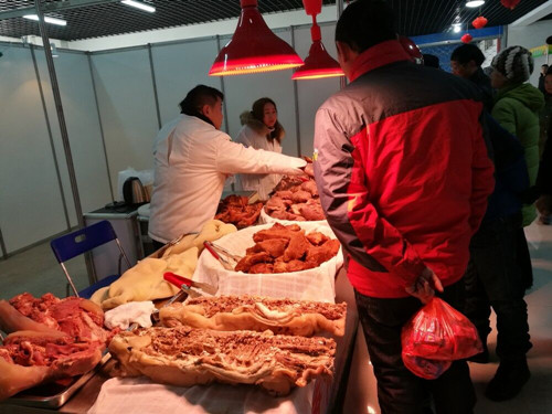 展會(huì)主要分蔬菜、水果、水產(chǎn)、糧油、干貨、熟食六個(gè)區(qū)域,展出的商品除各區(qū)優(yōu)勢(shì)產(chǎn)品,還展出了黃酒、臘肉、香腸等具有春節(jié)特色且能增添過(guò)年氣氛的一些傳統(tǒng)年貨食品。展會(huì)開幕不久,通農(nóng)小廚參展的熟食展位就被采購(gòu)的人群圍住,產(chǎn)品銷售火熱。另外,保健品、茶葉、糖酒類產(chǎn)品也有眾多商品參與此次展會(huì)。