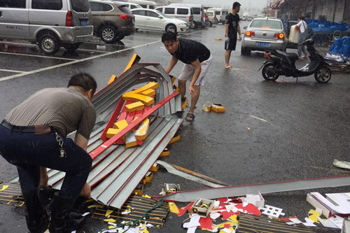 8月17日,暴風(fēng)雨來襲時,現(xiàn)場人員發(fā)現(xiàn)好幾家商鋪廣告牌有脫落現(xiàn)象,干貨區(qū)領(lǐng)導(dǎo)小組迅速組織人員一一排查,及時清理了脫落的廣告牌,并對現(xiàn)場進(jìn)行隔離,同時物業(yè)科人員積極配合處理現(xiàn)場,由于及時發(fā)現(xiàn),及時處理,避免了人員傷害。此外,對各片區(qū)積水情況進(jìn)行監(jiān)督,必要時組織足夠的排澇工具進(jìn)行強(qiáng)排,確保經(jīng)營戶正常經(jīng)營和財產(chǎn)安全。