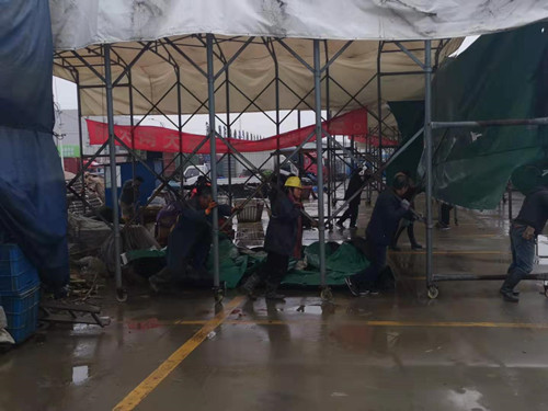 26日由水果交易區(qū)經(jīng)理帶頭,管理人員組隊(duì),集中在南場(chǎng)地,移動(dòng)大棚。雖然天公不作美,陰雨綿綿,但大家卻是干勁十足。帶著手套,喊著號(hào)子,發(fā)揮不怕苦、不怕累的精神,齊心協(xié)力,將十幾個(gè)大棚全部移動(dòng)完畢。