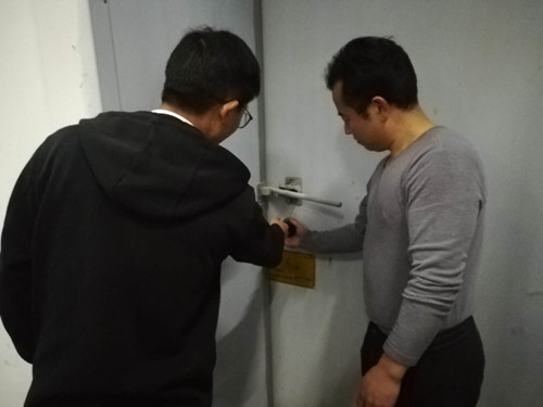 為讓商戶掌握相關(guān)技能,冷鏈部安全人員還現(xiàn)場演示了被困后如何正確使用逃生門。商戶詹秋明在馬鵬飛的協(xié)助下正確打開逃生門,成功”逃生”。