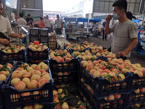 通農(nóng)物流水果交易區(qū)桃子專區(qū)有經(jīng)營(yíng)戶50多戶,一般從三月下旬開(kāi)始售賣到九月中下旬結(jié)束,記者通過(guò)工作人員了解到,今年水果交易區(qū)桃子交易量較去年增加了50%,但交易額呈倒掛趨勢(shì),反而下降了20%。經(jīng)營(yíng)戶說(shuō):今年桃子產(chǎn)量高,端午節(jié)前雨水多,桃子不易儲(chǔ)存,賣不掉就會(huì)爛掉,還沒(méi)地方處理,導(dǎo)致桃子價(jià)格大跳水,安徽毛桃批發(fā)價(jià)在1-2元/斤,大黃桃3-4元/斤,蟠桃2.5-3.5元/斤?!敖衲晷星椴恍校袌?chǎng)上根本賣不動(dòng),拉貨的也少,一是受疫情影響,老百姓的消費(fèi)能力下降,糧油、肉菜是剛需,不能不吃,還有沒(méi)能上班的市民每個(gè)月只能拿到基本工資,過(guò)緊日子就不吃水果了。二是供需關(guān)系,今年桃子豐收,量多,老百姓買得少,供大于求,價(jià)格差不多是去年同期的一半。”