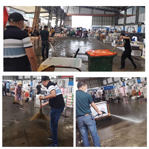 隨著氣溫升高,夏令水果銷售量不斷攀升,水果交易區(qū)內(nèi)車水馬龍,一片繁忙的景象。然而,氣溫過高,水果存放周期縮減,桃子、葡萄這類不耐存放的水果極其容易出現(xiàn)損耗、腐爛情況。為進(jìn)一步做好疫情防控期間交易區(qū)內(nèi)環(huán)境衛(wèi)生清潔工作,有效防止疫情地發(fā)生與傳播,營(yíng)造干凈、整潔地交易環(huán)境,水果區(qū)開展了一系列環(huán)境整治活動(dòng)。