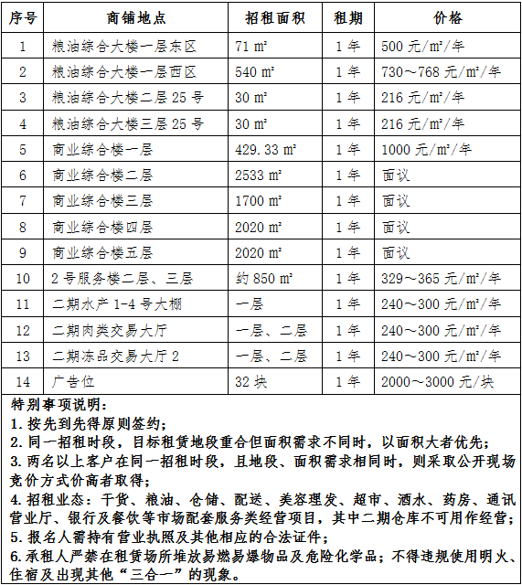經(jīng)研究,對(duì)通農(nóng)物流干貨部對(duì)少量旺鋪及廣告位進(jìn)行公開招租,具體信息如下: