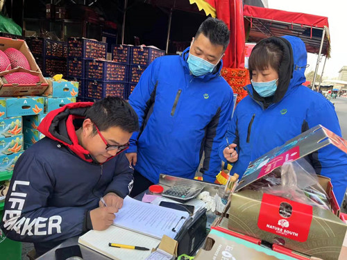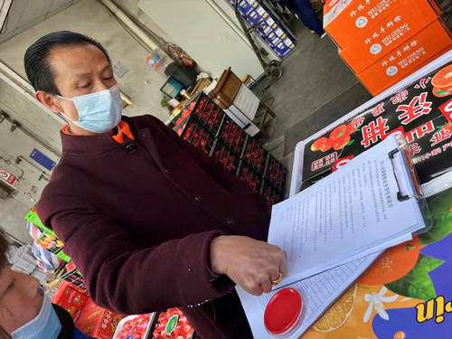 排查中,水果區(qū)按照重點片區(qū)排查和日常巡查檢查相結(jié)合的方式,加大力度開展進口水果排查工作,嚴格執(zhí)行索證索票,同時簽訂《進口水果銷售安全責任承諾書》。對其中出現(xiàn)的不符合“三?!币髽藴驶蛉鄙傧嚓P(guān)證明的進口水果實施登記,并要求經(jīng)營戶立即下架,等待后續(xù)核酸檢測結(jié)果,合格后才可繼續(xù)銷售。水果區(qū)經(jīng)理范一凡要求各片區(qū)責任人每天巡查后,填寫《進口水果疫情防控檢查表》,如實做好記錄。