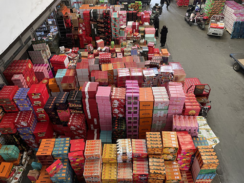 一眼望去,贛南臍橙、阿克蘇蘋果、陜西獼猴桃、海南西瓜、廣西砂糖橘、智利車?yán)遄?、泰國龍眼……各種水果應(yīng)有盡有,貨源供應(yīng)充足,各種水果精品禮盒摞成小山,目前普通水果銷售火爆,禮盒銷售也漸入佳境。