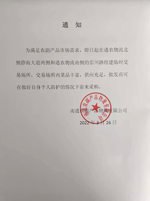 為滿足農(nóng)副產(chǎn)品市場需求,即日起在通農(nóng)物流北側(cè)靜海大道兩側(cè)和通農(nóng)物流南側(cè)的崇川路組建臨時(shí)交易場所,交易場所內(nèi)菜品豐富,供應(yīng)充足,批發(fā)商可在做好自身個(gè)人防護(hù)的情況下前來采購。