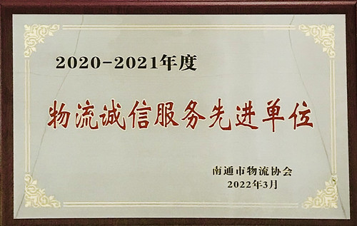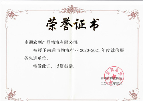 2022年3月,南通農副產品物流有限公司通過南通市物流協(xié)會的復核審查,再次榮獲“南通市物流行業(yè)2020-2021年度誠信服務先進單位”稱號。