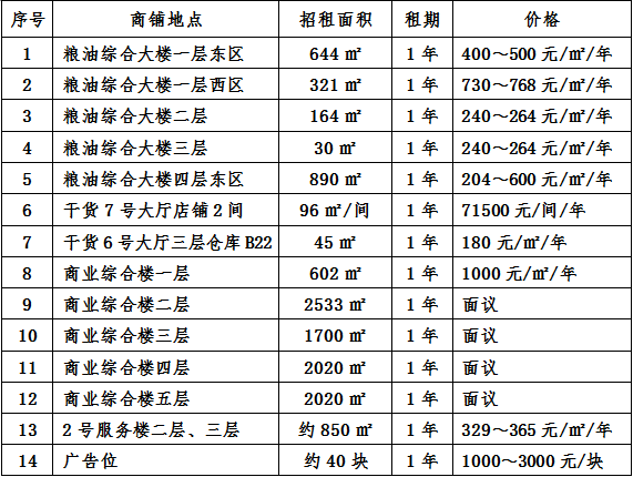 1.招租業(yè)態(tài):干貨、糧油、倉儲、配送、美容理發(fā)、超市、酒水、藥房、通訊營業(yè)廳、銀行及餐飲等市場配套服務(wù)類經(jīng)營項目;對應(yīng)標的物所能從事的經(jīng)營業(yè)態(tài),最終解釋權(quán)歸干貨配送部;