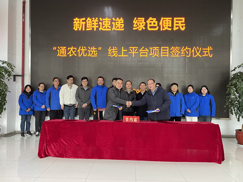 3月6日上午,“通農(nóng)優(yōu)選”線上平臺與南通甜璽辰貿(mào)易發(fā)展有限公司正式簽約。通農(nóng)物流黨總支副書記、總經(jīng)理孟宏與南通甜璽辰貿(mào)易發(fā)展有限公司代表單建峰簽署“團(tuán)購協(xié)議書”,就南通市內(nèi)社區(qū)團(tuán)購達(dá)成合作。