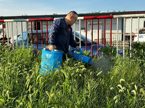 盡管正值高溫酷暑時(shí)節(jié),水果區(qū)業(yè)務(wù)經(jīng)營(yíng)主管陳躍華毫不畏懼,主動(dòng)清除雜草。只見(jiàn)他手持噴霧器,一絲不茍地進(jìn)行細(xì)致噴灑,確保不遺漏任何一個(gè)角落。汗水如同斷了線的珠子,不斷從他的額頭滑落,浸濕了衣服,但他依然堅(jiān)持不懈地工作著,毫無(wú)懈怠。