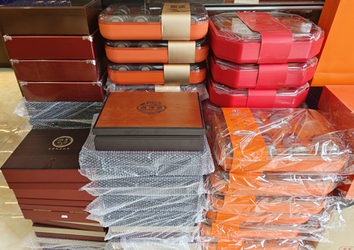 店鋪內(nèi)老板及工作人員正忙著為客戶裝茶打包,從與老板交流中了解到,顧客在選茶上更多看中茶葉的品質(zhì)和價(jià)格。今年的禮盒包裝主打簡(jiǎn)約風(fēng),很受消費(fèi)者的青睞。目前通農(nóng)物流干貨區(qū)茶葉備貨很足,價(jià)格也較優(yōu)惠。店鋪老板說(shuō):“相較于往年,今年茶葉的價(jià)格有所下降,市民以購(gòu)買較為平價(jià)的禮盒為主,300-400元的禮盒銷量最好,像武夷巖茶、大紅袍、肉桂、黃金芽等性價(jià)比高,近期非常熱銷。最近茶葉禮盒訂單劇增,每天備貨、裝盒、送貨、從早忙到晚,銷量是平時(shí)的兩倍?!保ǜ韶浥渌筒?嚴(yán)勻蔓)